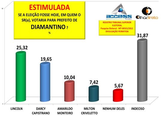 O candidato peessedista Juviano Lincoln é apontado como o favorito nas pesquisas mas indecisos são maioria em Diamantino. Levantamento Access Brasil aponta que na estimulada, em que o nome dos candidatos é apresentado ao eleitor, Lincoln totaliza a preferência de 25,32%.