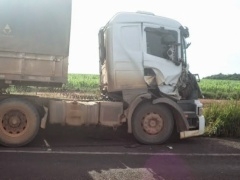 Osmar disse que se deparou com dois caminhões, um rebocando o outro, parados no meio da pista sem sinalização, e para evitar uma batida frontal, Osmar tirou sua carreta para o lado esquerdo da via e vindo a bater somente o lado esquerdo de seu caminhão na traseira do segundo que estava sendo rebocado por um cambão.