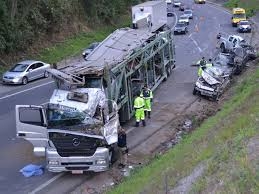 Carreta cegonha carregada com veículos sai de pista e tomba na BR-174