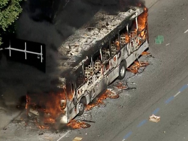 Manifestantes atearam fogo em um ônibus no Estácio (Foto: Reprodução/ TV Globo)