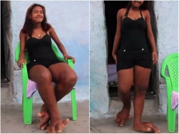 É impressionante: os pés crescem a cada dia. Desde pequena foi assim. Ela tem uma condição rara que faz os pés crescerem demais