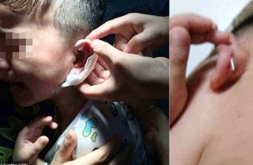 Os pais de um menino de quatro anos de idade ficaram chocados ao descobrir que o ouvido de seu filho tinha sido grampeado por seu professora de jardim de infância na China.