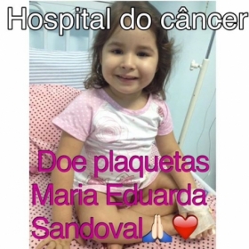 Maria Eduarda Sandoval, uma menina de três anos e sete meses diagnosticada com leucemia aguda precisa urgentemente de doadores de plaquetas de sangue. De acordo com Camila Sandoval, tia da criança, todo o estoque de plaquetas e de sangue que foram coletados na primeira campanha já foram consumidos.