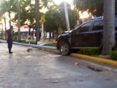 O acidente foi esta madrugada, na avenida Rio Grande do Sul, próximo a um supermercado. O condutor perdeu o controle de um Renault, preto, que atingiu e derrubou um poste de iluminação pública. O carro ficou no canteiro central.