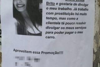A Polícia Civil investiga um caso de difamação contra uma estudante universitária de 23 anos. Cartazes associados à prostituição foram colados com os dados de Bruna Souza Brito na região onde ela trabalha. Posteriormente, as imagens foram parar na internet e a jovem passou a receber mensagens de supostos clientes do mundo todo