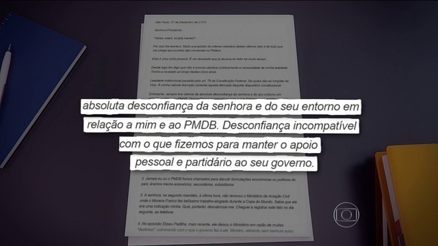 Entretanto, sempre tive ciência da absoluta desconfiança da senhora e do seu entorno em relação a mim e ao PMDB. Desconfiança incompatível com o que fizemos para manter o apoio pessoal e partidário ao seu governo.Basta ressaltar que na última convenção apenas 59,9% votaram pela aliança.E só o fizeram, ouso registrar, por que era eu o candidato à reeleição a Vice.