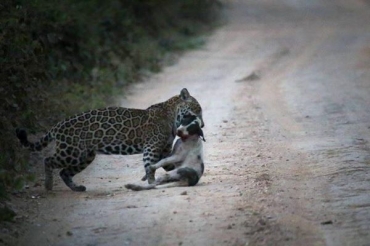 Uma onça-pintada atacou um cachorro em uma comunidade rural conhecida como Acorá, região de chácaras, distante cerca de 30 quilômetros do perímetro urbano de Chapada dos Guimarães (64 km de Cuiabá). O registro foi feito por um motorista que passava pelo local no momento do ocorrido.