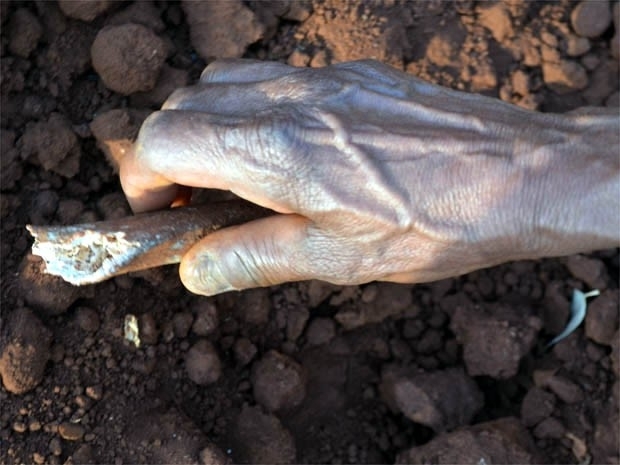 Marlene escavou com as mãos nuas os montes terrosos à procura de indícios que confirmassem a sua denúncia. Recolheu gravatas, calça, camisa, flores e véus, além de segurar pedaços das supostas ossadas previamente recolhidos. “Não tenho medo, lavo as mãos com álcool depois.”