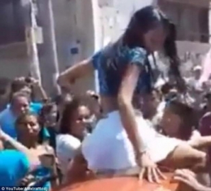 O clima é de descontração total. A garota empolga a "plateia" com uma dancinha sensual. Muitos ali presentes chegam a tocar a garota. Até levantam a saia dela, deixando à mostra o shortinho que ela estava vestindo por baixo.
