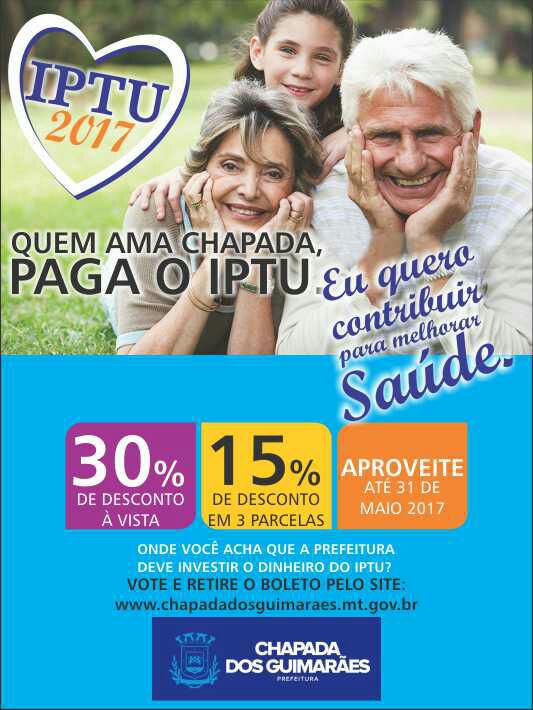 Prefeitura de Chapada Lança Campanha do IPTU 2017 Contribuinte em dia com o imposto dos anos anteriores terá 30% de desconto à vista e 15% em até três parcelas, até o dia 31 de maio de 2017