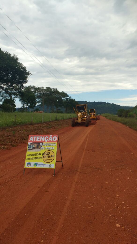 O serviço está sendo executado com recursos do FETHAB, e após o início da estiagem, facilitando também o acesso dos ônibus escolares que buscam alunos nas comunidades rurais, uma vez que o perímetro rural estava comprometido pelo grande volume de chuvas nestas vias de acesso as propriedades rurais.