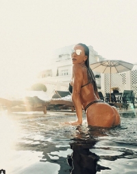 Na imagem, publicada em seu perfil no Instagram na manhã de hoje, a apresentadora aparece usando um biquíni sensual enquanto se refresca na piscina do hotel Belmond Copacabana Palace, no Rio.
