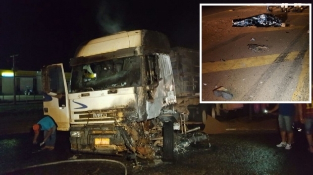 Com o impacto, o veículo de carga pegou fogo e o Corpo de Bombeiros apagou as chamas.