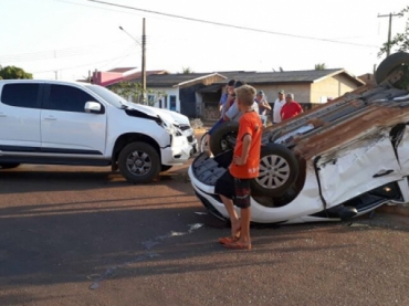 Carro tomba após colisão com caminhonete em Sinop; motorista ferido