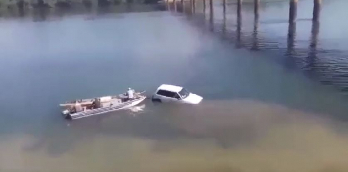 Carro perde o freio e veículo afunda em pesqueiro; veja o vídeo Imagens feitas por um celular mostram o momento em que 3 pessoas em um barco, tentavam retirar o veículo da água.
