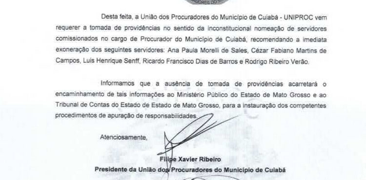 “Desta feita, a Uniproc vem requerer a tomada de providências no sentido da inconstitucional nomeação de servidores comissionados no cargo de procurador do Município de Cuiabá, recomendando a imediata exoneração dos servidores citados”.