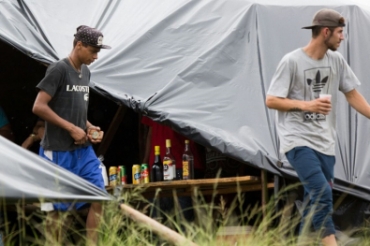 São pelo menos três pontos de venda de bebida alcoólica no local. Eles ficam bem escondidos, no meio das barracas, para não chamar atenção.