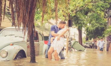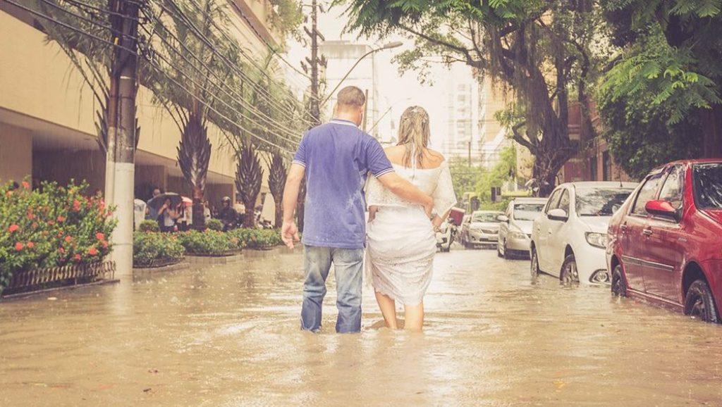 Apesar do temporal que deixou o bairro de Icaraí, em Niterói, debaixo d'água, um casal de noivos não se abalou com a chuva forte e fez um ensaio fotográfico em plena rua alagada na tarde desta sexta-feira (23). Nas imagens, é possível ver o fotógrafo que acompanha o casal na chuva. O alagamento chega até o joelho dos três.