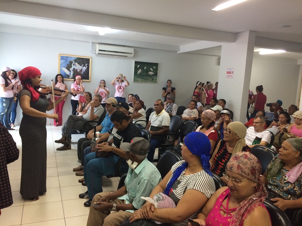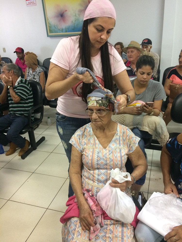 “Quando me vi sem cabelo pela primeira vez foi um choque, mas hoje eu me acho bonita, principalmente quando coloco um lenço. O mais importante é não perder a auto-estima. Eu sempre digo que 99% da cura do câncer depende muito de você e nos mantermos bem ajuda muito. Por isso, uma ação como a que essas voluntárias estão fazendo hoje nos deixa muito felizes”, afirmou Lucídia, após amarrar o seu lenço novo na cabeça.