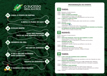Investidores, gestores e pecuaristas terão a oportunidade de conferir o caminho das pedras da lucratividade. De 3 a 4 de dezembro, o evento “O Sucesso Deixa Rastros” traz a Cuiabá palestras e cases para inspirar e orientar os interessados em melhorar a eficiência na gestão de propriedades rurais.