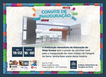 Mais uma escola da Rede Adventista de Educação será inaugurada no dia 19 de fevereiro, às 16h em Tangará da Serra, município com mais de 100 mil habitantes, segundo o IBGE.