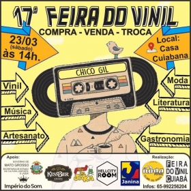 A 17ª edição da ‘Feira do Vinil’ acontece neste sábado (23), na Casa Cuiabana, a partir das 14h. Além da tradicional venda e troca de discos, o evento contará com iniciativas de gastronomia, moda e literatura. A entrada é gratuita.