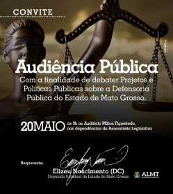 No intuito de debater projetos e ideias para melhorar a atuação dos defensores públicos em Mato Grosso, o deputado Elizeu Nascimento (DC) solicitou a realizaçãode uma audiência pública na Assembleia Legislativa de Mato Grosso (ALMT). O evento será na segunda-feira (20), às 9h, no auditório Milton Figueiredo.