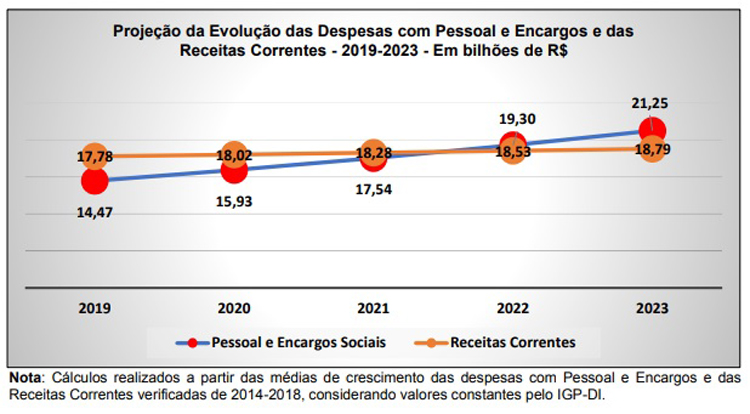 O gráfico ainda mostra que o descompasso, em 2023, será ainda maior: R$ 2,5 bilhões. A projeção é de R$ 18,7 bilhões em Receita Corrente Líquida e R$ 21,2 bilhões de gastos com pessoal e encargos sociais. Para 2019, a projeção é de R$ 14,4 bilhões com gastos com pessoal e encargos sociais e R$ 17,7 bilhões de receita.