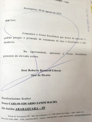 O juiz da Vara de Execuções Penais de Araraquara (SP), José Roberto Bernardi Liberal, se recusou a apreciar um pedido de outro magistrado, o juiz auxiliar Carlos Alberto Zanini Maciel, devido ao tratamento que recebeu. De acordo com o ofício polêmico que circula nas redes sociais, do dia 20 de agosto deste ano, Liberal exige ser tratado com o pronome “Excelência”, e não “Senhoria”, como foi chamado.