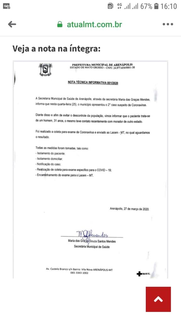 A Secretaria Municipal de Arenápolis, emitiu nota assinada pela titular da pasta Maria das Graças Souza Santos Mendes, dando conta de um novo caso suspeito de Covid-19 na cidade.