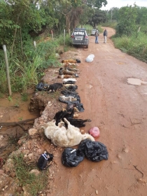 No local, os policiais encontraram 18 animais mortos, uma placenta com filhotes também mortos, todos descartados inadequadamente. As diligências seguem para identificar o responsável pelo descarte dos animais.