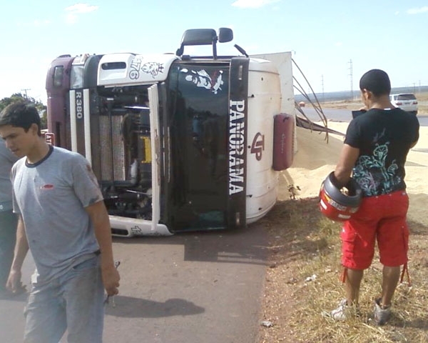 Parte da carga ficou espalhada na pista, interrompendo parcialmente o tráfego de veículos no local. O condutor aguarda a chegada a Polícia Rodoviária Federal, que tomará as providências necessárias.