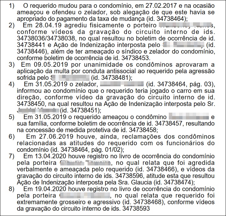 Mais adiante, a magistrada afirmou que os documentos e fatos expostos na ação deixam claro que que Namir possui um “comportamento antissocial”, que dificulta o convívio com os demais moradores e funcionários do condomínio.