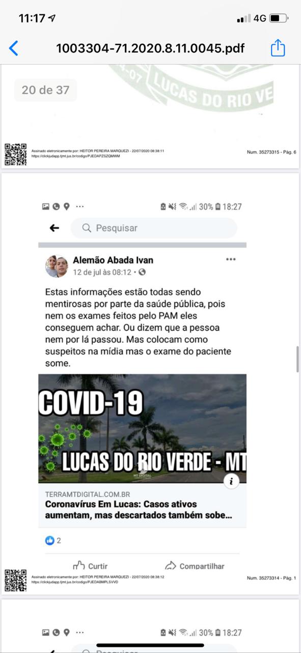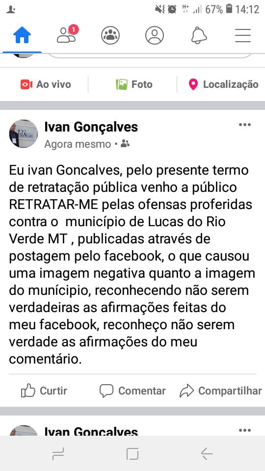 Em tempos de Fake News quando tramita no Congresso Nacional projeto para impedir a disseminação de notícias falsas pela internet (PL 2630/2020), Mato Grosso teve um internauta interpelado judicialmente por cometer ofensas e publicar informações caluniosas contra a Prefeitura. O caso ocorreu em Lucas do Rio Verde (distante 330 km de Cuiabá) e, nesta terça-feira (15.09), Ivan Gonçalves fez um post em seu perfil reconhecendo, por meio de uma retratação pública, que faltou com a verdade na divulgação de informações sobre o situação da Covid 19 via Facebook e Instagram.