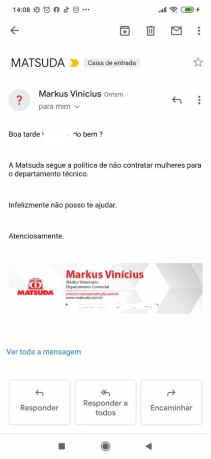 A resposta do e-mail viralizou nas redes sociais, após pessoas se revoltarem com o machismo exposto. Até o fechamento desta reportagem, a publicação contava com 9,8 mil curtidas. No e-mail, um médico veterinário explica que não pode contratá-la, pois “a Matsuda segue a política de não contratar mulheres para o departamento técnico”.