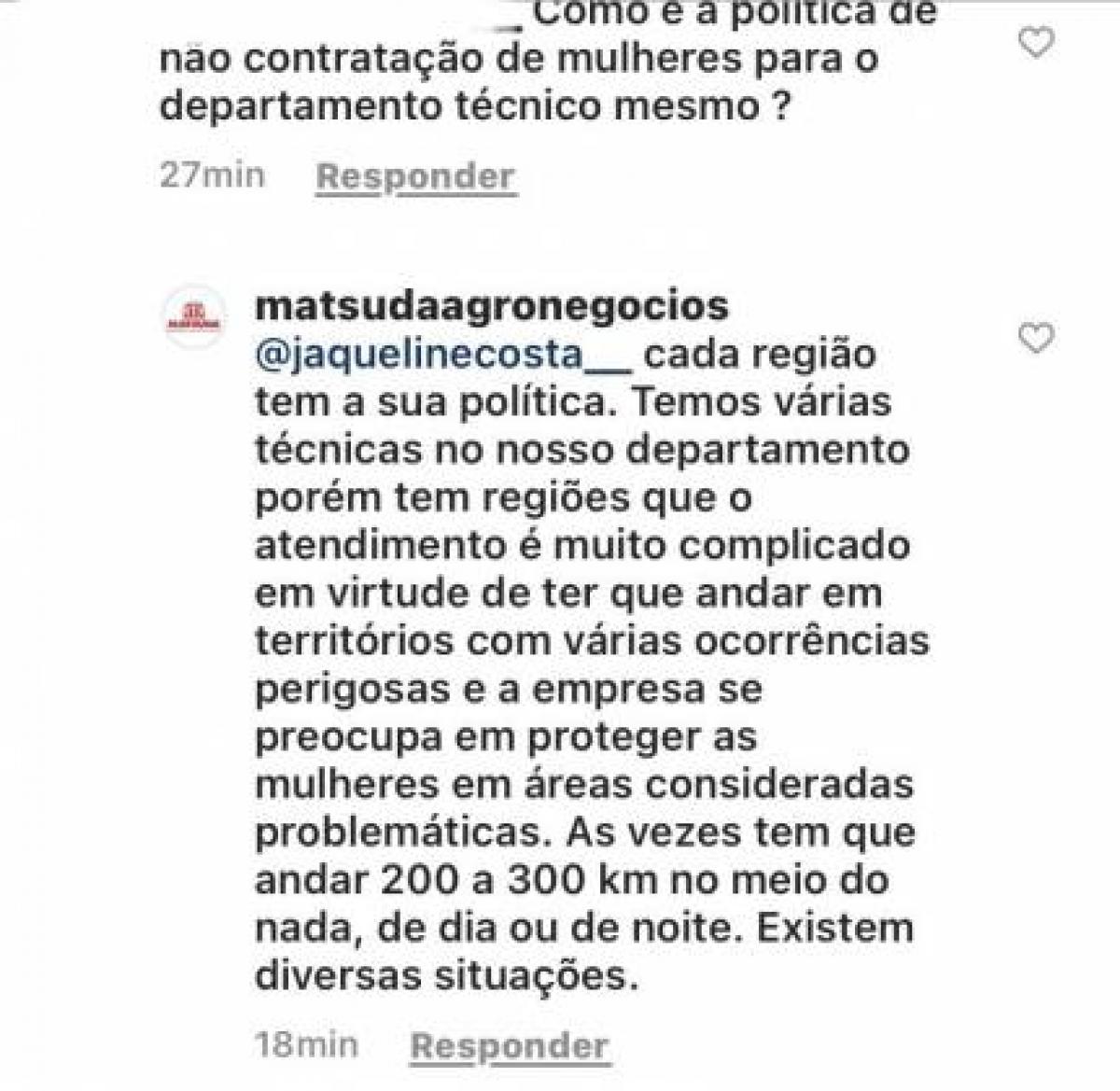 Uma estudante de medicina veterinária, que pediu para não ser identificada por medo de represálias, enviou currículo para uma vaga de estágio da empresa do agronegócio Grupo Matsuda. No entanto, recebeu como resposta que a empresa não contrata mulheres para o departamento técnico. O caso viralizou nas redes sociais e revoltou não só os estudantes da área, como também mulheres de diferentes partes do país.