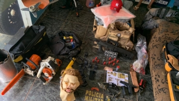 Foram apreendidas uma espingarda, uma pistola Glock 9 mm, um revólver calibre 32, oito barras que aparentavam ser ouro, duas capas e um colete balístico.
