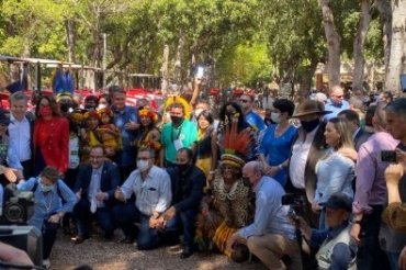 O presidente da República, Jair Bolsonaro (sem partido), participa da entrega de máquina e equipamentos agrÃcolas para comunidades indÃgenas em Mato Grosso. O evento ocorre no Hotel Fazenda Mato Grosso e conta com a presença do governador Mauro Mendes (DEM) e de outras autoridades estaduais.