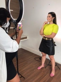 Além de maquiadora, Mayara também é modelo plus size. Fator que foi preponderante para criar o projeto “Luz, câmera, produção”. “Com a pandemia, a gente teve de criar novas ideias. Então, resolvi reutilizar o espaço que já tinha aqui para ofertar mais esse serviço às clientes. E a gente acaba aproveitando a experiência que temos como modelo e ofertando um trabalho bem diferenciado a elas”, diz Mayara.