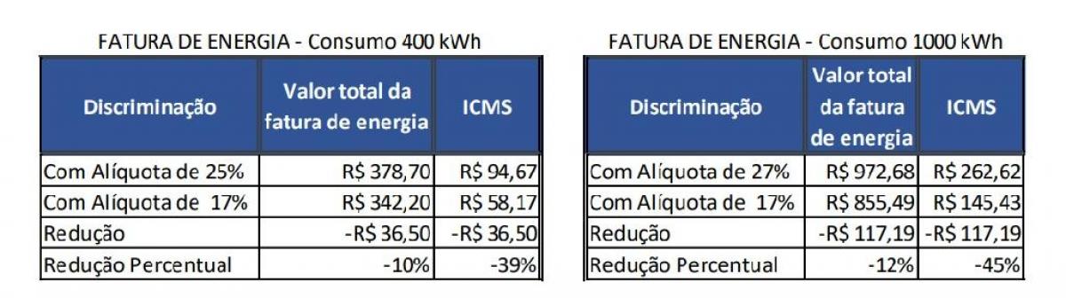 Na conta de luz, uma das maiores demandas da população, o impacto dessa redução, ou seja, a carga tributária do imposto, será de R$ 36,50 no consumo de 400 kWh e de até R$ 117 no consumo de 1000 kWh. Um corte de 39% e 45%, respectivamente.