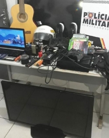 Os policiais foram até a residência, localizando a dona do imóvel que disse que haviam arrombado a janela de sua casa, danificado o portão e levado uma televisão, perfumes, peças de roupas e inúmeros objetos e pertences pessoais. Todo o material furtado foi recuperado pela PM. O suspeito foi encaminhado para a Delegacia de Polícia Judiciária Civil.