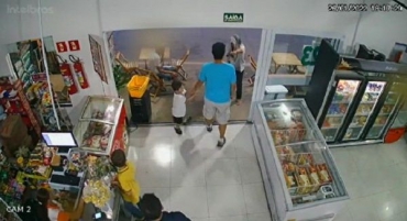 Na sequência, o homem que estava com uma criança é abordado pelo criminoso, que anuncia o assalto. Imediatamente, o cliente reage, pega arma do ladrão e o atinge com um chute. O criminoso acabou caindo em uma lixeira que estava do lado de fora e depois foge.