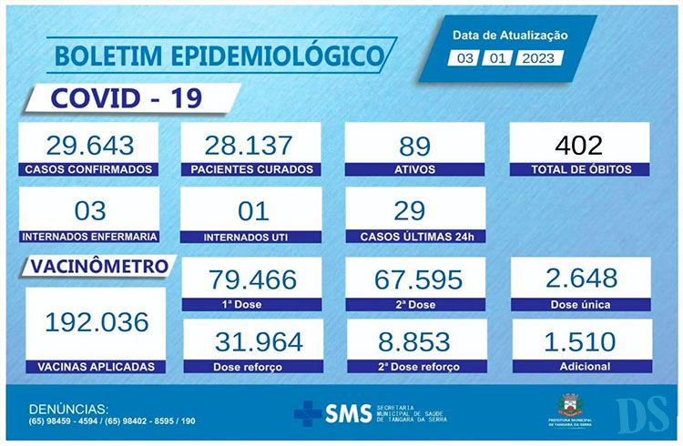 Prestes a fechar um mês sem registrar nenhuma morte por Covid-19, em Boletim Epidemiológico divulgado nesta terça-feira, 3, pela Secretaria de Saúde Municipal, Tangará da Serra registrou a primeira morte pela doença do ano de 2023, chegando a 402 vidas perdidas para o vírus que continua circulando no mundo.