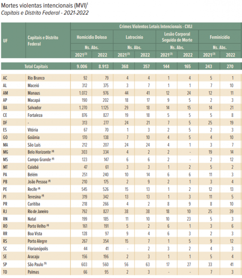 Anuário apresentou dados sobre as capitais dos estados, sendo que em Cuiabá, por exemplo, foram registrados 47 homicídios dolosos em 2021 e 61 em 2022 e 5 feminicídios em 2021 e 2 em 2022.