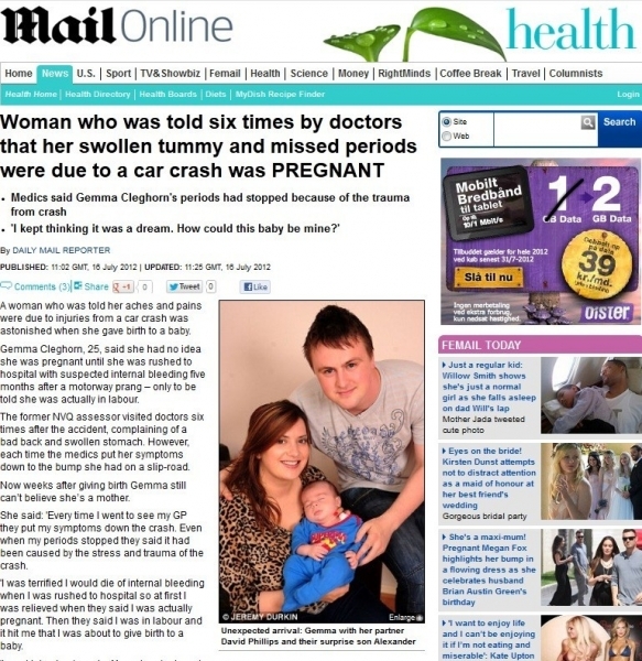 Antes de ganhar Alexander, que nasceu com 3,2 kg, a jovem foi ao médico com queixas de abdômen inchado, dor no estômago e nas costas, e ausência de menstruação. Mas os especialistas creditavam os sintomas ao estresse e ao trauma provocados pelo choque na estrada, e recomendavam analgésicos.