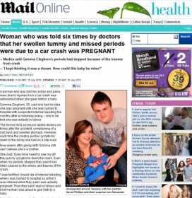 Uma mulher inglesa de 25 anos que havia sido informada seis vezes pelos médicos de que sua barriga inchou e sua menstruação foi interrompida por causa de um acidente de carro em janeiro estava, na verdade, grávida.