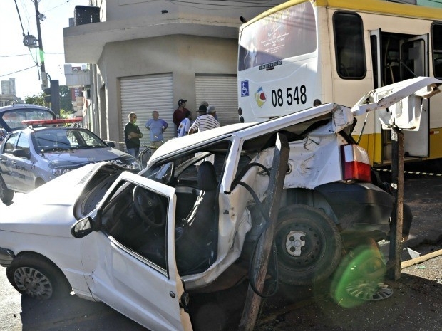 Acidente entre ônibus e carro em Cuiabá (Foto: Leandro J.Nascimento/G1)