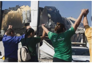 Após finalizar a reunião realizada no ginásio Dom Aquino, os comerciantes se reuniram em frente aos destroços do Shopping Popular.