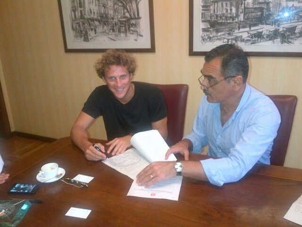 O atacante Diego Forlán oficializou na tarde desta sexta-feira o contrato para defender o Internacional. O jogador uruguaio, que deixou a Inter de Milão, da Itália, postou uma foto em seu Twitter na qual assinou o compromisso com o clube gaúcho - o melhor jogador da Copa do Mundo de 2010 permanecerá no time colorado até julho de 2015.