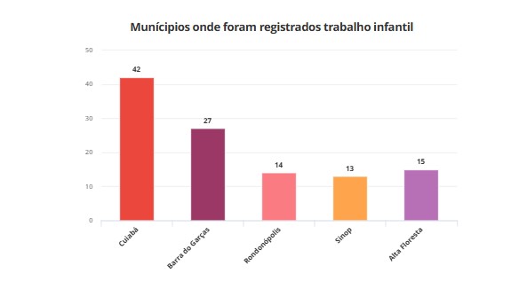 Os registros de trabalho infantil foram protocolados em diferentes municípios do estado, com destaque para Cuiabá que teve mais de 40 registros de trabalho infantil no ano passado.